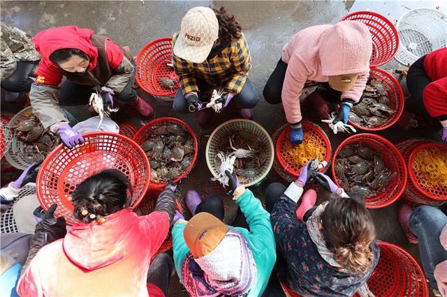 近日,江苏省连云港市赣榆区沿海,秋捕梭子蟹喜获丰收。梭子蟹日到港量达20多万公斤,当地渔民及时将梭子蟹分拣、装箱、打包、外运,供应各地市场。(司伟 吴苏红)